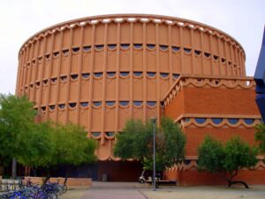 The circular, tiered structure adjacent to Gammage Auditorium solves an architectural challenge: how do you build next to a Frank Lloyd Wright masterpiece without embarrassing yourself? William Wesley Peters — Wright’s son-in-law — answered that question with contextual wit in 1970. He adopted Wright’s circular geometry and “Desert Rose” stucco but inverted the form. Where Gammage spreads horizontally, the Music Building stacks vertically in wedding-cake tiers. The decorative metal latticework wrapping each level in turquoise and gold adds playful ornamentation that Gammage would never tolerate — it’s the difference between the master’s restraint and the apprentice’s exuberance.