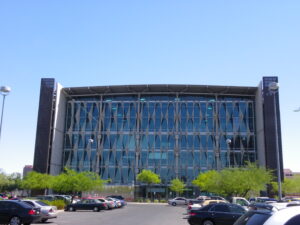 Curving elevated walkways connect the buildings, creating an architectural conversation across the lawn. The structure houses Katzin Concert Hall, the massive Fritts Organ and hundreds of soundproof practice rooms. The building is best viewed from the Gammage lawn at sunset when the Desert Rose stucco glows. The Music Library is open to visitors during academic hours.