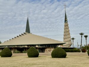 The diamond-shaped church complex on Seventh Avenue just south of Glendale Avenue is a Frank Lloyd Wright design that Wright never saw built. In 1950, he drew plans for a Southwest Christian Seminary that went bankrupt before construction. Twenty years later, William Wesley Peters — Wright’s son-in-law — retrieved the blueprints from the Taliesin archives and adapted them for this church site. The diamond-grid geometry rejects every right angle, creating sharp corners and prow-like edges that feel indigenous to the landscape. The 77-foot triangular campanile stands detached from the sanctuary, a three-sided lantern tower supported by open pillars that allow desert air to pass through.