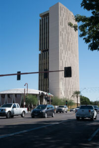 The 19-story tower at Central Avenue and Osborn Road earned its “Punchcard Building” nickname through architectural serendipity. W.A. Sarmiento designed the narrow vertical slot windows in 1964 for solar shading, but their rhythmic pattern accidentally mimicked the punch cards that fed IBM mainframes. The complex anchors Central Avenue through contrasting geometries: a curved tower (subtly concave on one face, convex on the other) paired with twin rotundas ringed by inverted parabolic arches. Gold-anodized aluminum creates a metallic shimmer that shifts as the sun moves — this building changes color by the hour.