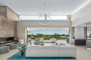 The moment you notice it, you can’t un-see it. The travertine running from the kitchen floor continues, without interruption, beneath the pocketing glass doors and across the pool deck beyond. The ceiling treatment inside reappears outside. The fireplace on the interior wall finds its twin on the covered patio. The house doesn’t end — it simply changes state.