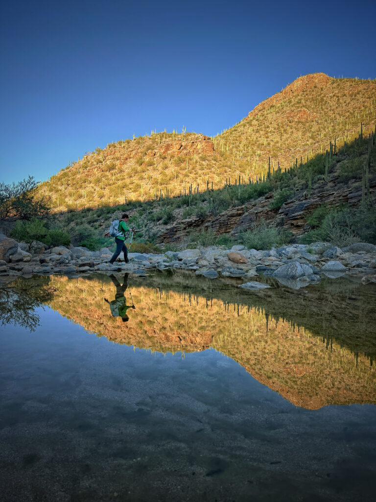 The logistics require intimate knowledge of place. After nearly two decades of hiking and running Tucson’s trails, Cyr knows exactly where water pools after storms — which bends in the washes collect runoff, which trail dips transform into temporary ponds. The serendipity now lies not in finding the water itself, but in what the light and weather happen to be doing when he arrives.