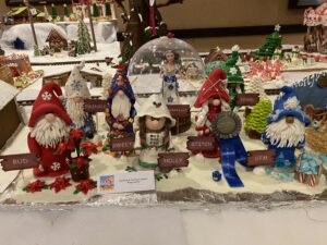 The technical achievement required strategic engineering: a small piece of Styrofoam beneath each face, toothpicks holding arms in place — well within the guidelines that allow 25% non-edible materials while requiring at least 25% gingerbread. The team far exceeded both requirements.