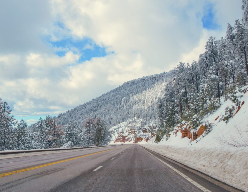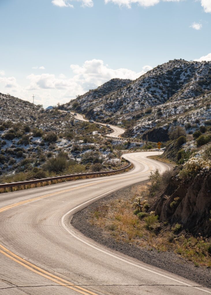 The road stretches ahead, a ribbon of asphalt cutting through a landscape transformed. Snow clings to desert vegetation, coating saguaros and ponderosas alike in unexpected white. The familiar Arizona terrain — the one we know in its sun-baked glory — has become something else entirely: ethereal, fleeting, magical.