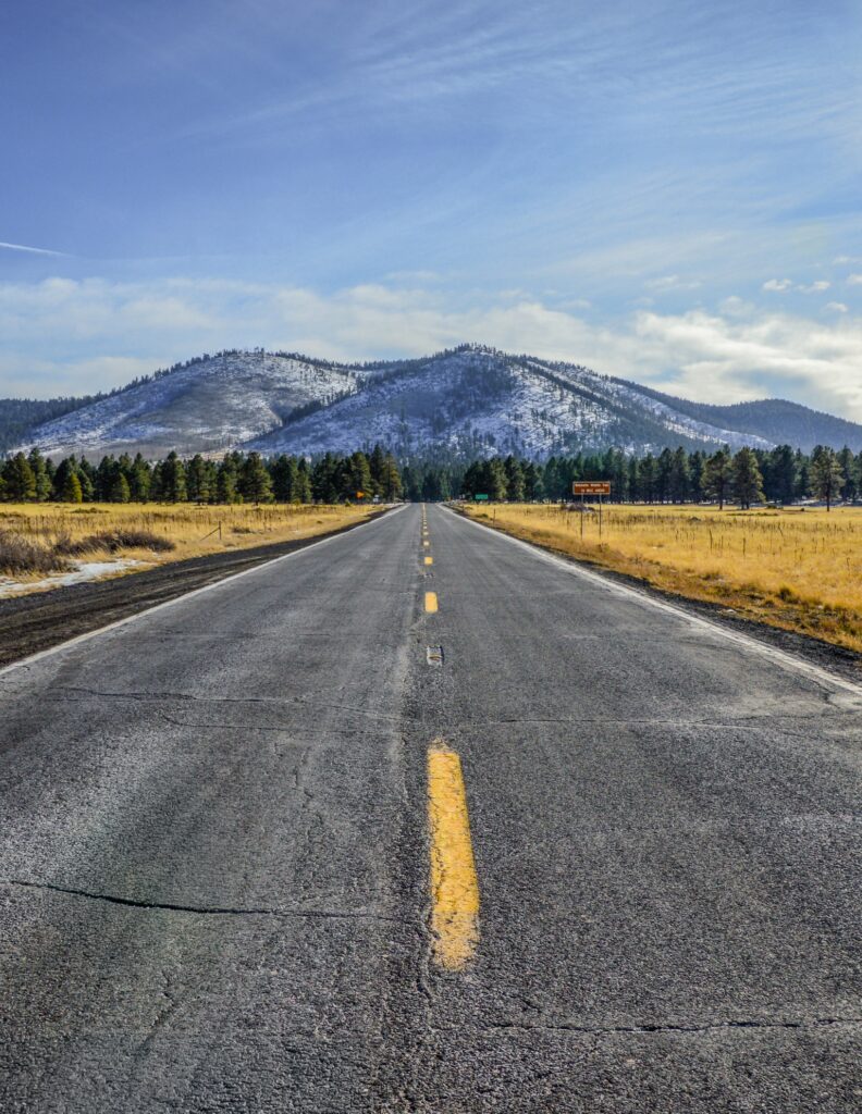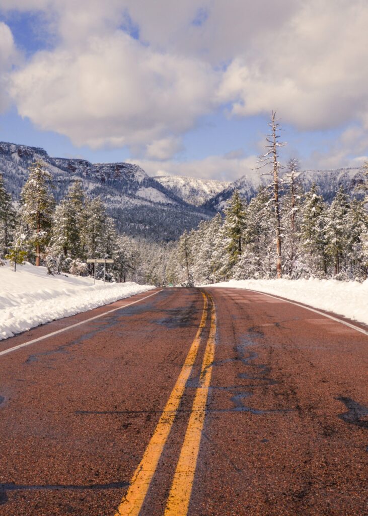 This month’s photo essay — a sequel to our previously published “See You Down the Road” and “On the Road Again” photo essays — showcases Archinuk’s ability to find wonder in the transient. Unlike the summer editions that preceded it, these images embrace a softer color palette — whites and grays punctuated by the enduring greens of conifers and the rust red of distant cliffs. The compositional element remains constant: roads that lead the eye forward, inviting exploration.